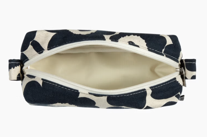 The Tiise cosmetic bag is made of an unbleached cotton and linen blend with a stain-repellent finish on the outside. The bag has a zipper closure and a nylon lining on the inside. The dark blue Mini Unikko pattern is printed in Helsinki.